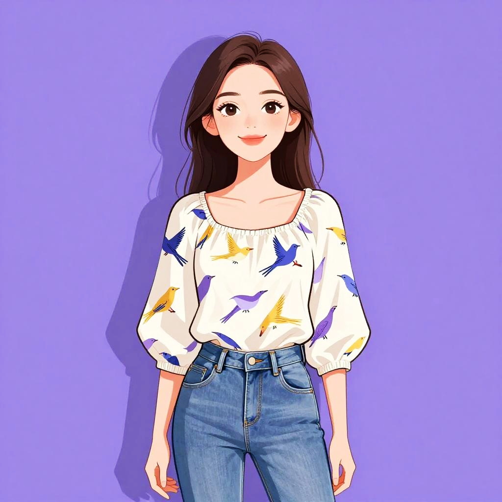 Digital illustration of an Asian woman with long, straight brown hair, fair skin, and a friendly smile. She's wearing a white blouse with blue and yellow bird patterns, and high-waisted blue jeans. The background is a solid lavender color, and her shadow is cast to the left. Her blouse has three-quarter sleeves, and she stands with a relaxed posture, hands by her sides. The style is bright, colorful, and cartoon-like.