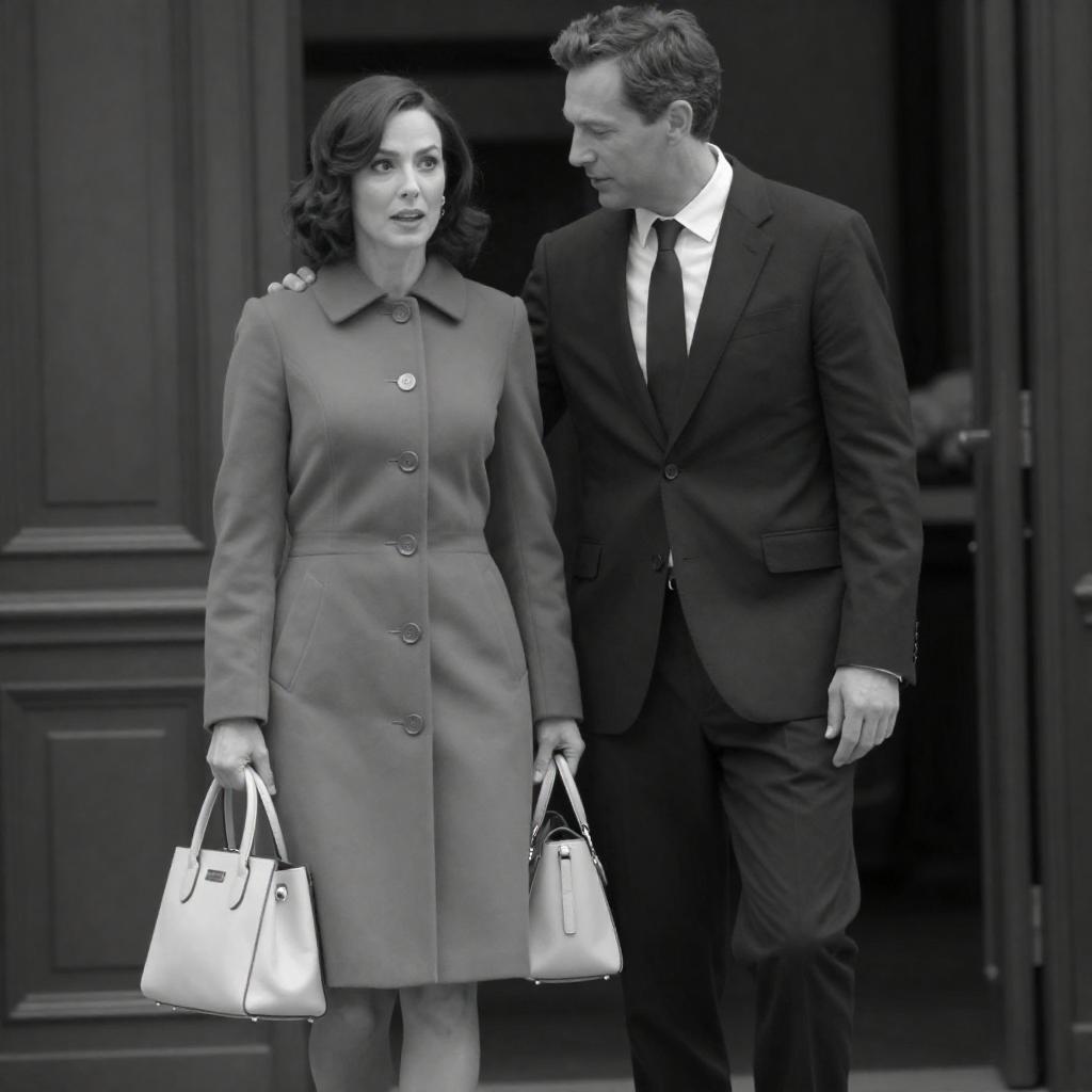 Black-and-white photograph of a man and woman standing close. Man in dark suit, white shirt, black tie, leaning towards woman. Woman in knee-length, buttoned coat, holding two white handbags, looking slightly surprised. Man's hand on woman's shoulder. Both have short, dark hair. Background includes wooden door and blurred interior. Man's shoes visible at bottom. Woman's left hand holding handbag by her side. Man's expression not clearly visible, woman's expression mildly surprised.
