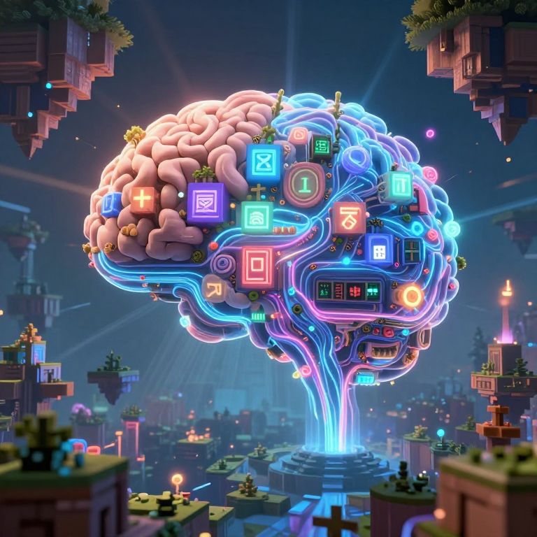 A surreal Mindcraft environment with floating islands made of thought blocks, glowing symbols, and abstract neural pathways, blending fantasy and sci-fi art styles, intricate details of a mind-building process, ethereal light rays and dynamic composition.
