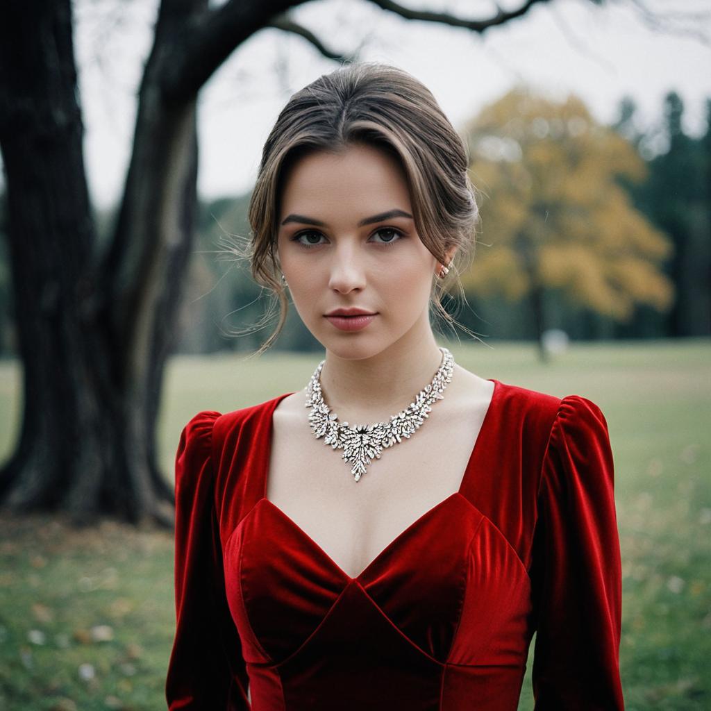 Portrait of a young woman with long wavy brown hair wearing a dark red velvet dress with long sleeves and two ornate necklaces. She is standing outdoors with a blurred green forest and field background, looking directly at the camera.