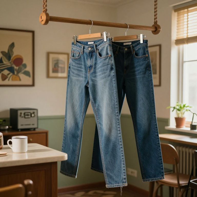 Jeans hanging on a wooden rack in a sunlit, vintage apartment with retro wall art and a coffee mug on the counter, soft natural light, warm tones, 8K detailed realism, cinematic composition.