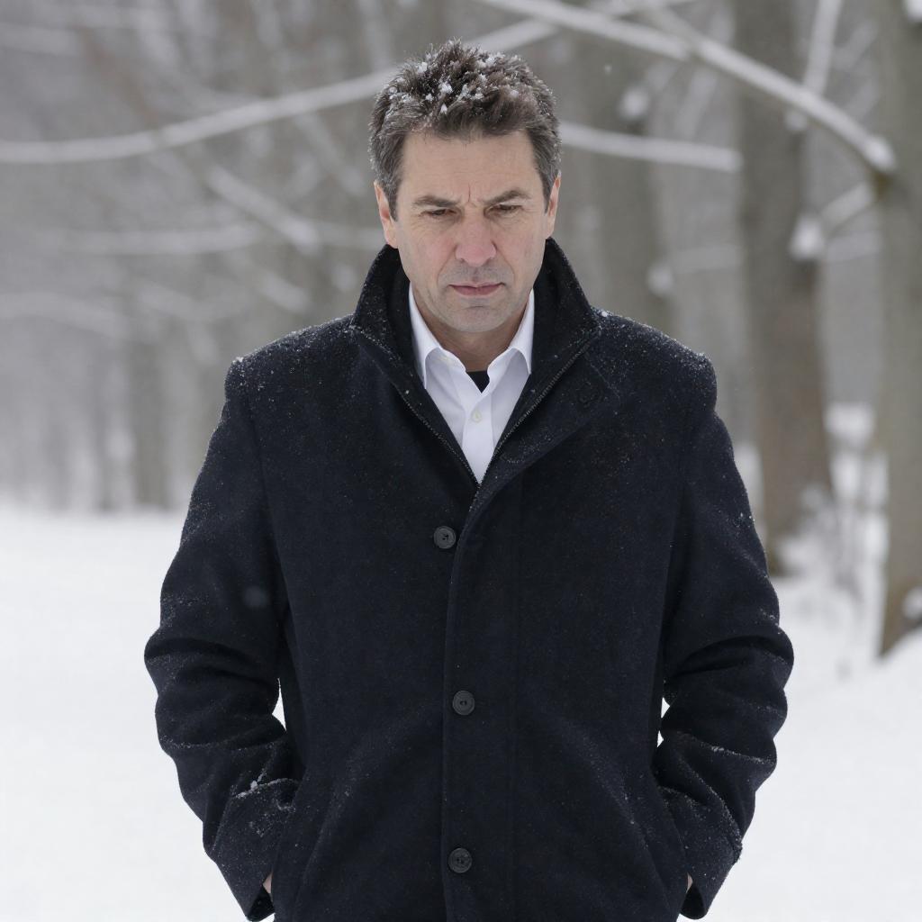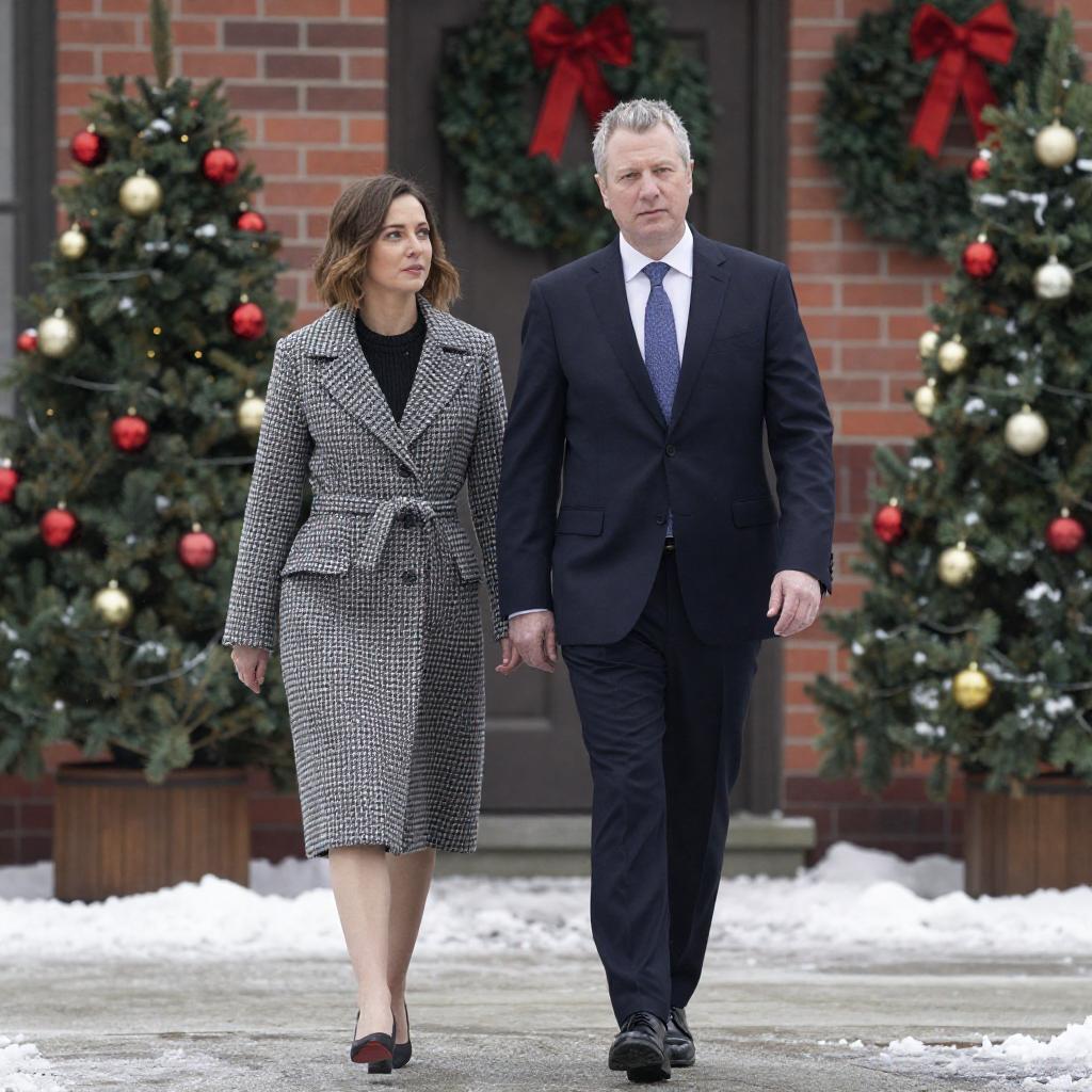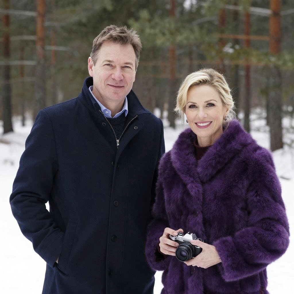 A middle-aged man and woman walking outdoors in a snowy ski resort setting. The man wears a black shirt, black pants, a belt with a silver buckle, and sunglasses. The woman is dressed in a red and white ski jacket, black pants, and glasses, holding a blue ski helmet and a red ski pole. They walk in front of a wooden building with yellow window accents, surrounded by snow-covered trees.