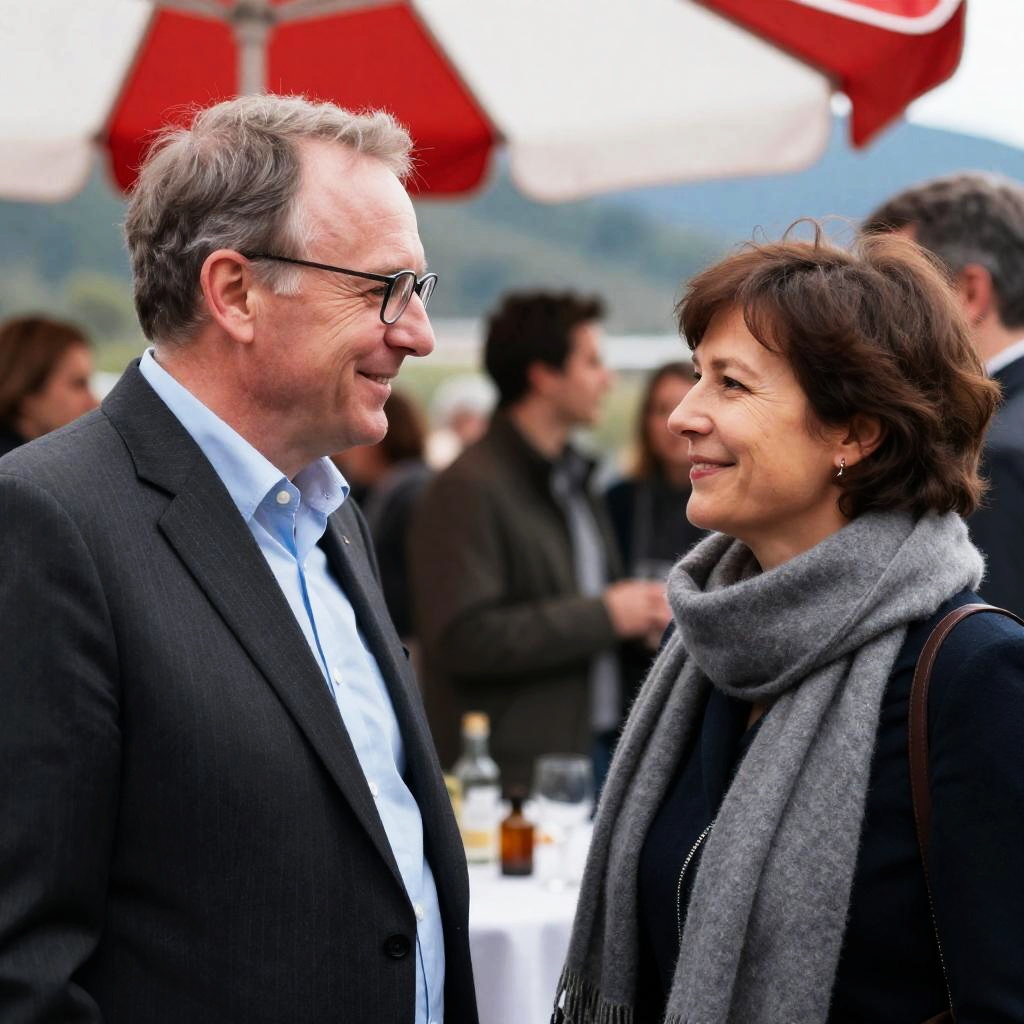 Photograph of a man and woman walking outdoors. The man, with dark hair, sunglasses, and a black shirt, wears a belt with a silver buckle. The woman, with short brown hair and glasses, wears a red and white ski jacket, holding a red ski pole and a blue helmet. They are in front of a wooden building with yellow accents. Snow-covered trees are in the background.