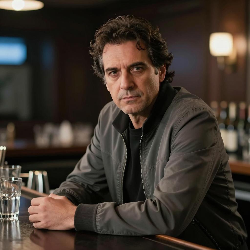 Middle-aged man with wavy, dark brown hair, slightly wrinkled skin, and furrowed brows, squinting with a slight smile. Background has large, blurred windows. Wearing a gray jacket over a dark shirt. Head and shoulders visible.