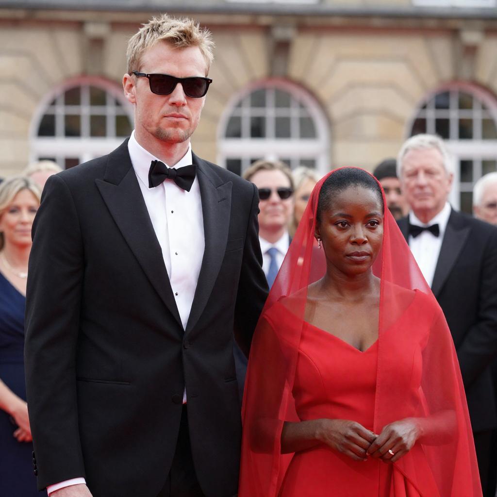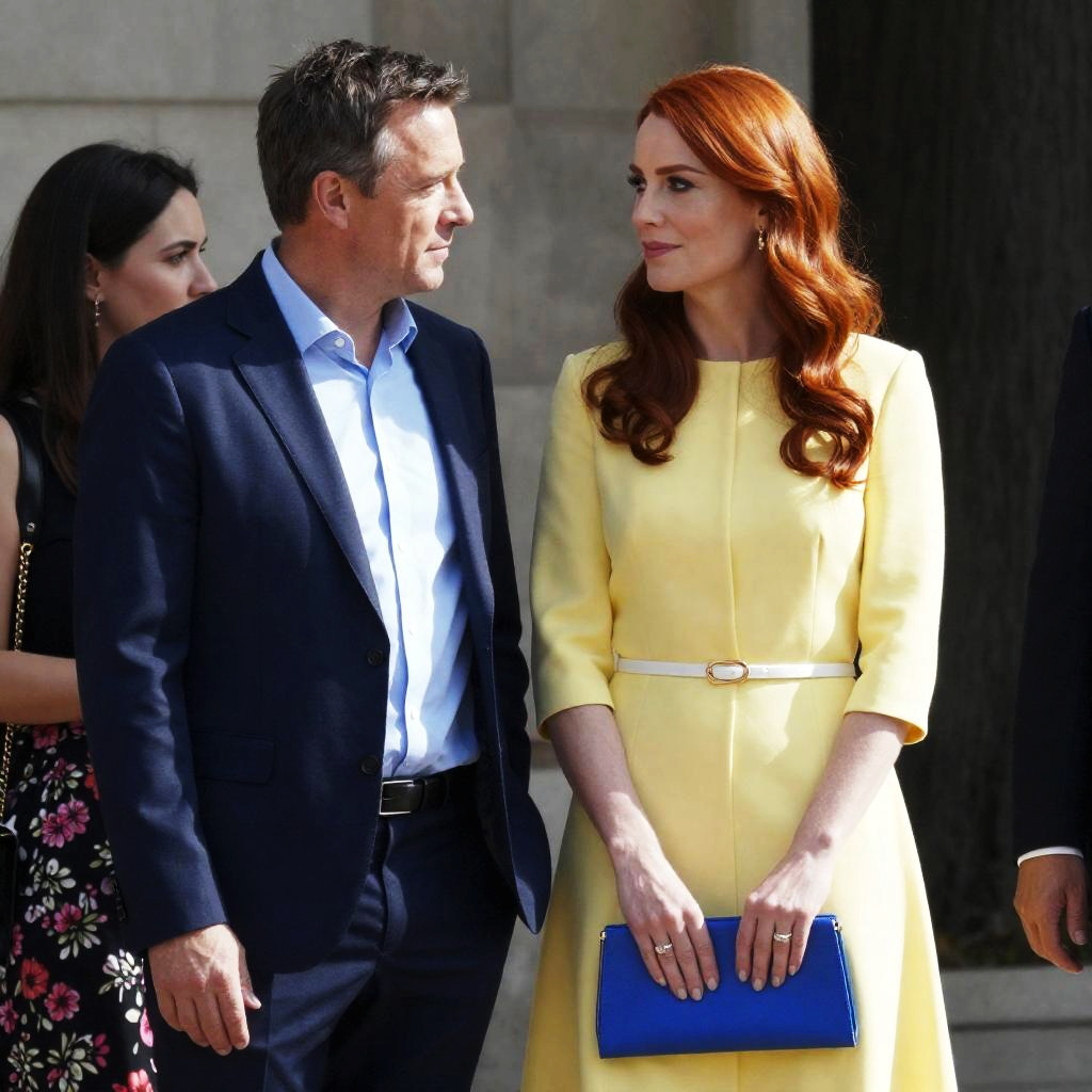 Photograph of six people in formal attire standing outdoors. A blonde woman in a blue velvet dress with white lace sleeves is centered, flanked by a blonde man in a gray suit, a brunette woman in a blue floral dress, a man with curly hair in a purple tie, a man in a yellow embroidered coat, and a woman with dark skin and black hair in the background.