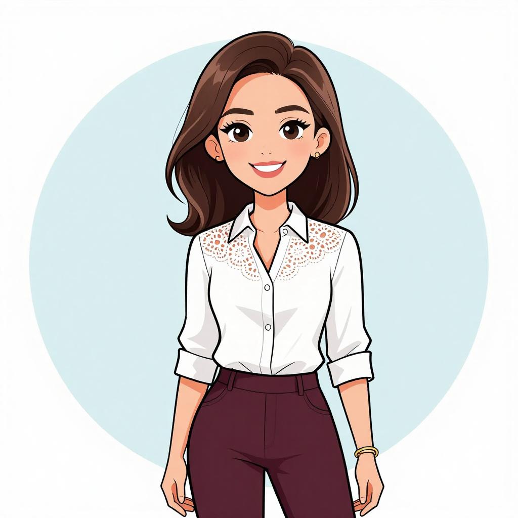 Woman with pretty face and pretty hair. smiling Woman, business casual, white blouse with lace detail on the chest, V-neckline, roll-tab sleeves, burgundy skinny pants, delicate gold bangle. --sref 1467