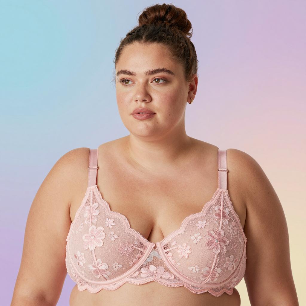 Photograph of a plus-size woman with light brown skin, dark brown hair in a bun, wearing a pink lace bra with embroidered floral patterns. She has light makeup, neutral expression, small gold earrings, and a colorful gradient background. She is centered, facing slightly to the right, with her shoulders and upper chest visible.