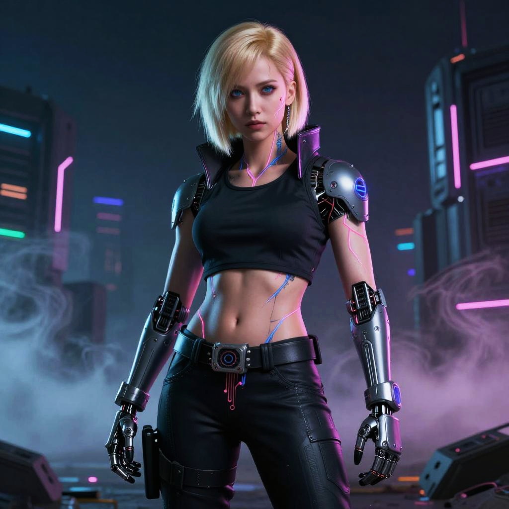 CGI image of a cyberpunk blonde woman with mechanical arms and shoulders, wearing a black crop top and leather pants, standing in a neon-lit