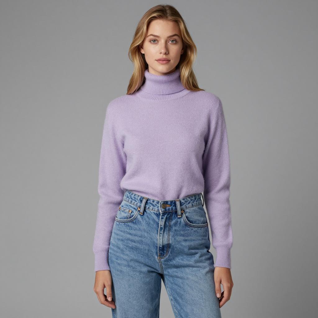 Photorealistic portrait of a young light-skinned woman with brown wavy hair, wearing a beige long-sleeve V-neck top layered over a cream high-neck turtleneck. She is also dressed in a beige pleated skirt and accessorized with a wide brown leather belt featuring a gold buckle. The woman stands against a neutral, slightly textured background with soft natural lighting, presenting a casual elegant style suitable for daytime fashion.