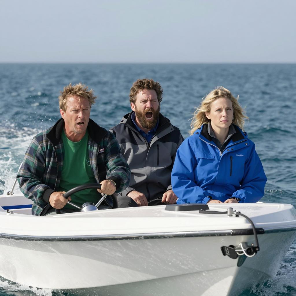 Three adults riding a white speedboat on the ocean during daylight with clear skies. A man in a green shirt and plaid jacket is steering the boat with an intense expression. Next to him, a bearded man in a gray jacket is shouting with his mouth open. A woman wearing a bright blue jacket sits calmly, looking forward. Water splashes around the boat as it moves through the waves.
