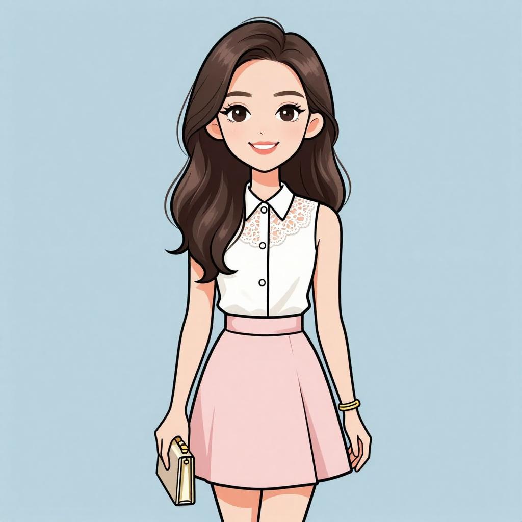 Woman with pretty face and pretty hair. smiling Woman, girly, sleeveless blouse in white with lace detailing at collar, light pink skater skirt, high waist, thin gold bracelet, holding a small, rectangular metallic clutch. --sref 1467