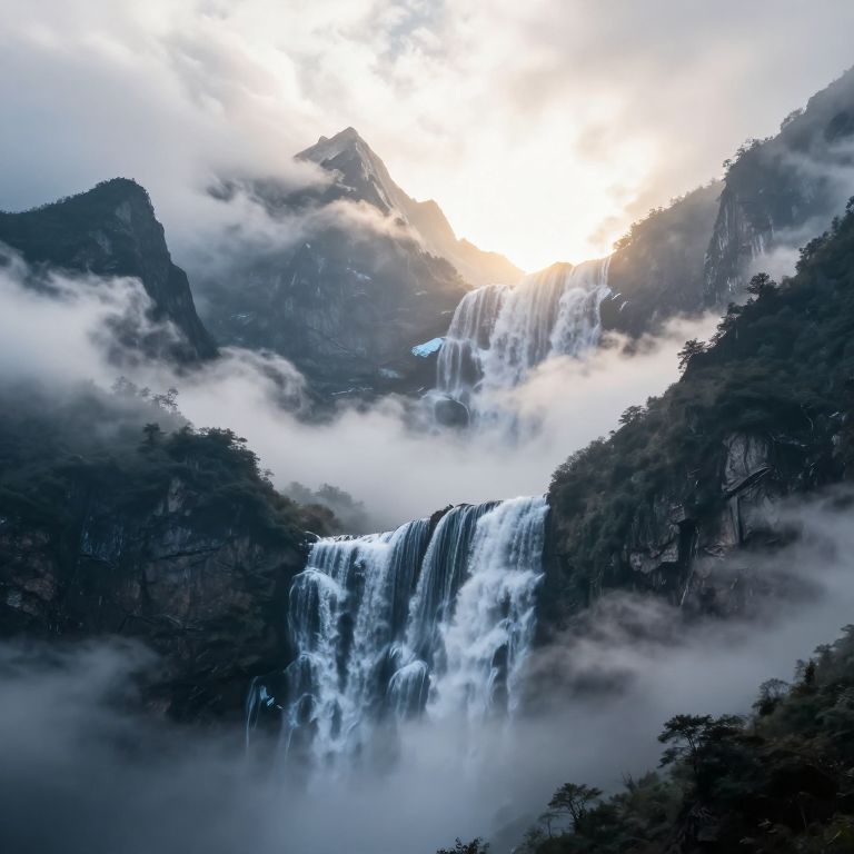 Jagged mountain peaks pierce through swirling clouds, their icy summits bathed in sunlight as cascading waterfalls defy gravity, flowing upward into a luminous void of ethereal light and mist.