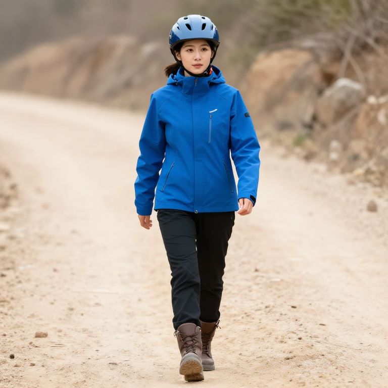 Female, wearing a blue jacket, black pants, and brown boots, is walking on a dirt road. She has a helmet on her head, and her hair is styled in a ponytail.