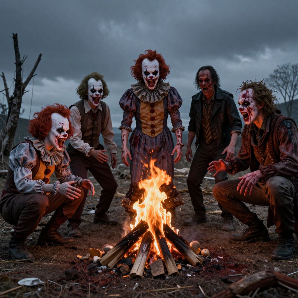 Bloody clowns gathered around a flickering campfire in a desolate wasteland, grotesque faces distorted with rage, blood splattered costumes, surreal nightmare style, ultra-detailed