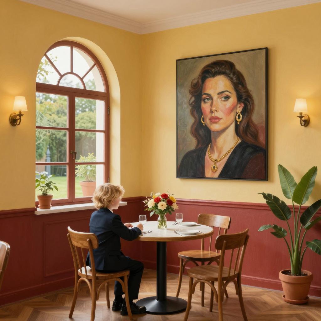 Painting of a restaurant interior. Large portrait of a woman with dark hair, earrings, and necklace on the wall. Child with blond hair in a suit sits at a table with a flower arrangement. Arched window shows a garden view. Yellow and red walls. Potted plant on the right.