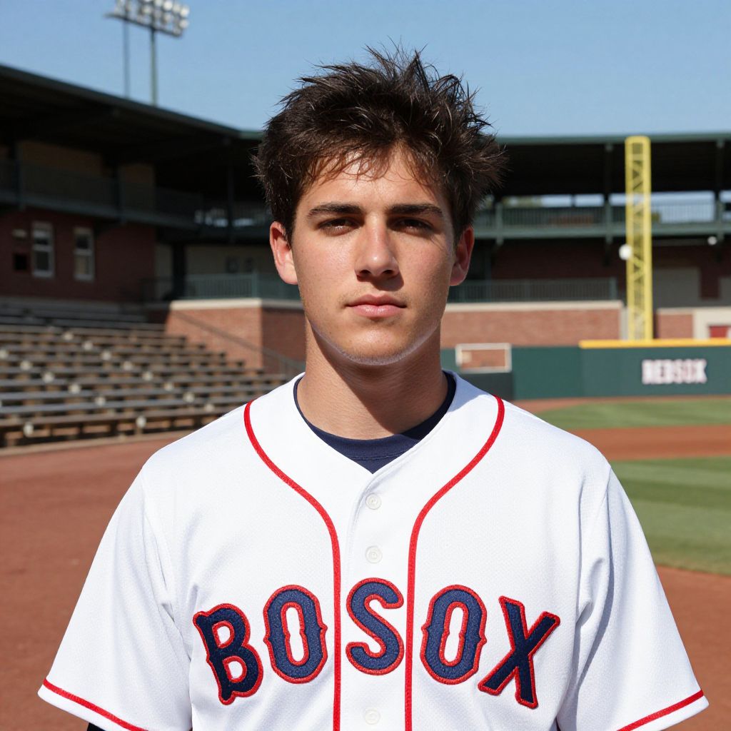 Photograph of a young man with short, dark, slightly messy hair, standing in front of a baseball stadium. He's wearing a white baseball jersey with red piping and "BOSOX" written in blue letters. The background shows a brick building, empty wooden bleachers, and a green outfield wall with a "REDSOX" sign. The sky is clear blue, indicating daylight.