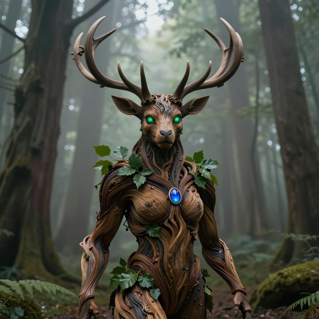 A mystical forest spirit character with a face and body made of intricately twisted wood, adorned with green leaves. The figure has glowing green eyes, large stag-like antlers, and a radiant blue gem embedded in the chest. The background is a foggy forest showcasing tall trees and soft sunlight filtering through.