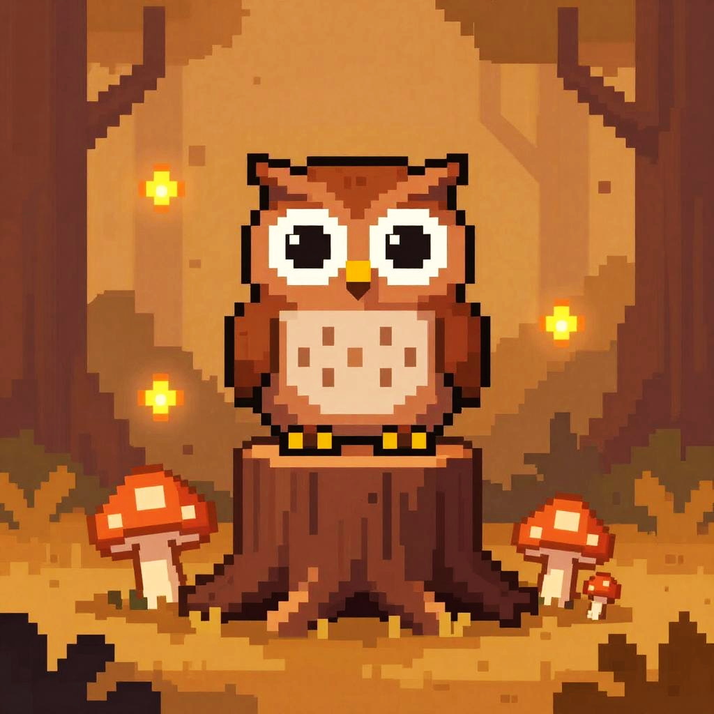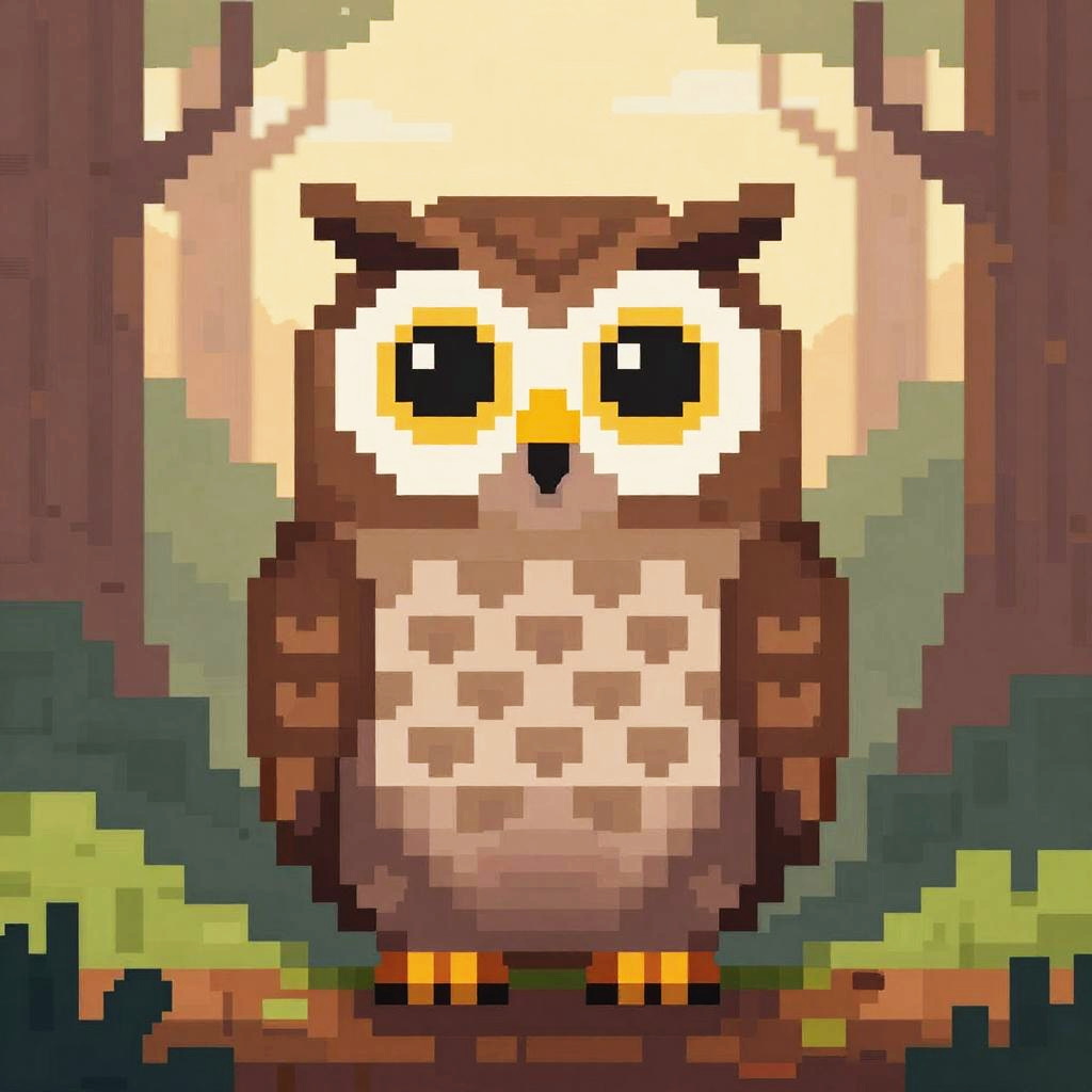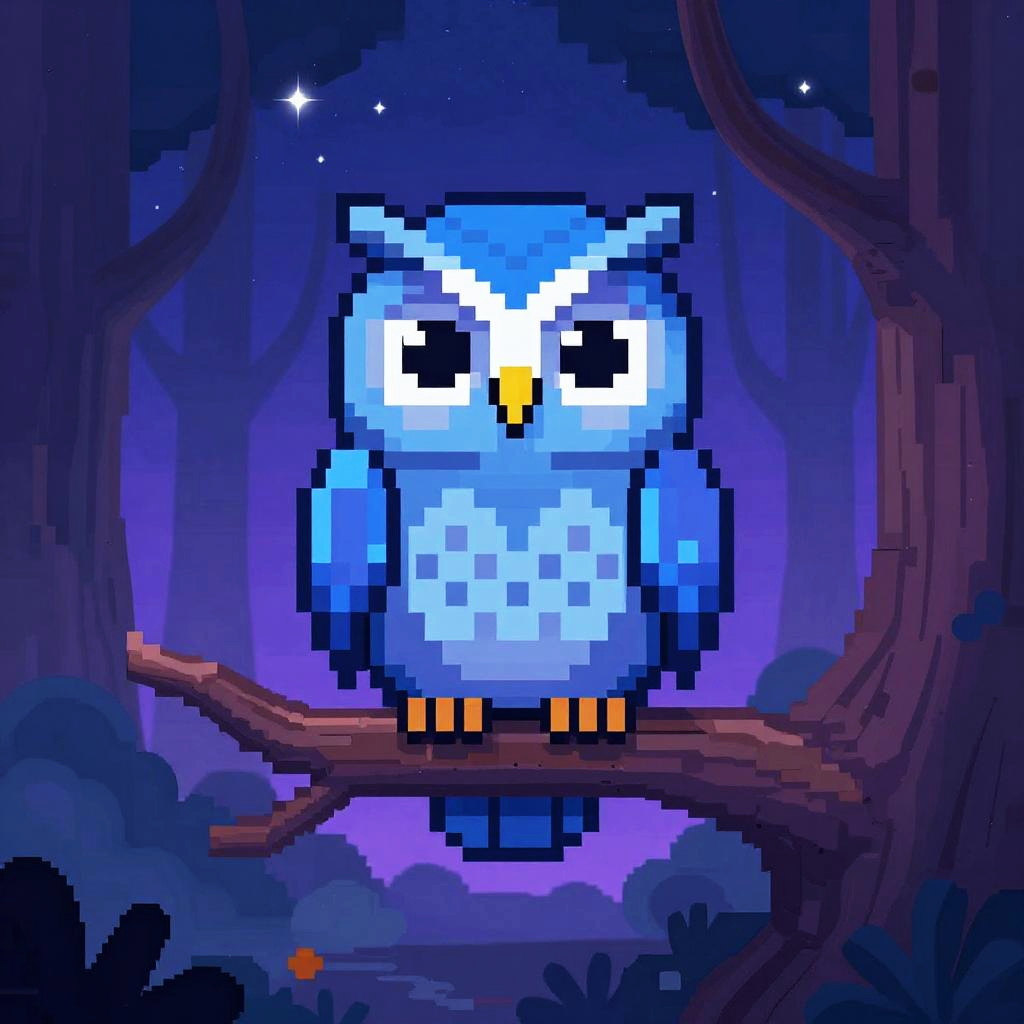 Pixel art of a white owl with grey wings and orange beak, glowing against a dark blue night sky with stars and mountains.