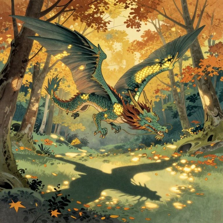 Craft an enchanting digital illustration inspired by Japanese ukiyo-e woodblock printing techniques, showcasing a magnificent dragon gracefully soaring over an idyllic autumnal landscape. Capture the dragon's awe-inspiring wingspan from a low-angle perspective as it glides effortlessly above a lush forest teeming with falling leaves. The scene should exude serenity and fascination, with the dragon casting an otherworldly shadow upon the peaceful surroundings while its scales brilliantly reflect the golden light filtering through the trees, creating an captivating interplay of shadows and reflections amidst the tranquil scenery.