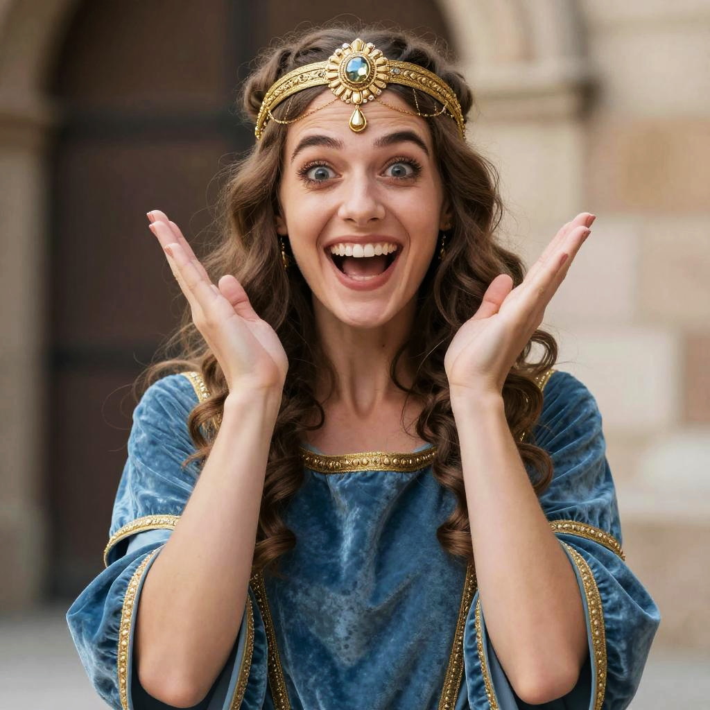 Funny medieval costume, woman in a blue dress and gold headpiece