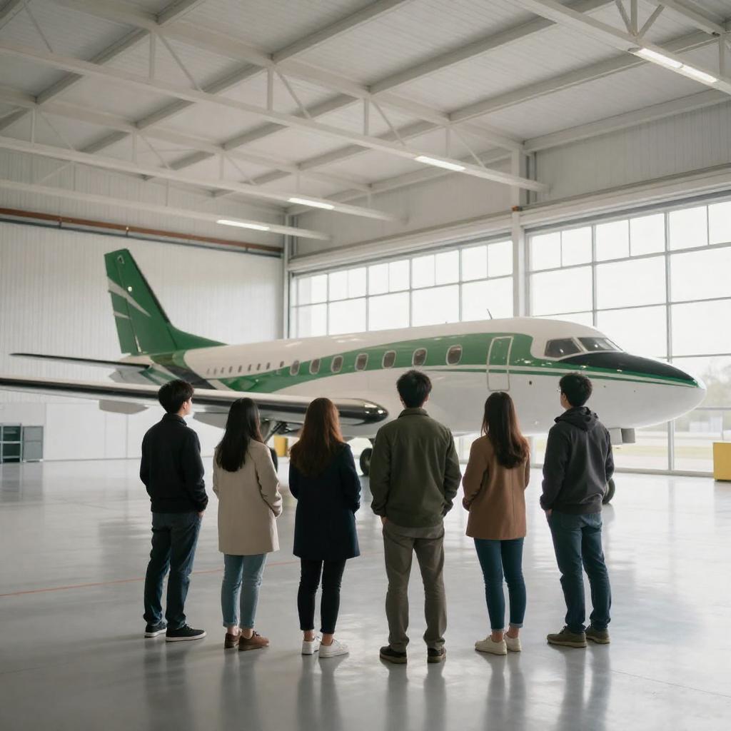A dimly lit hangar featuring a large, dark military aircraft in the foreground. The reflective floor highlights a person dressed in a black jacket and pants walking across the space. In the background, tables and chairs are arranged with another individual standing nearby, emphasizing the spacious industrial environment.