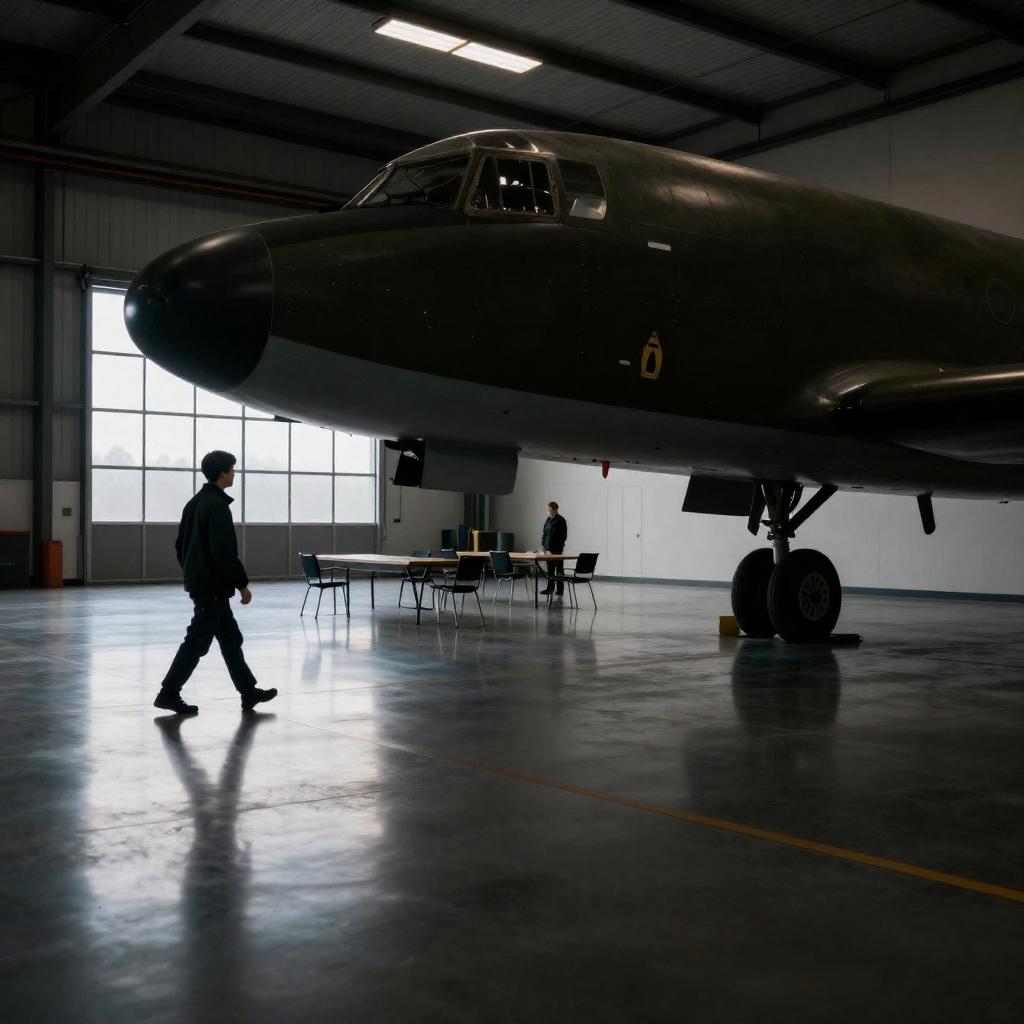 Photograph of a dimly lit hangar with a large, dark military aircraft in the foreground. A lone person in a black jacket and pants walks across the shiny, reflective floor. In the background, tables and chairs are arranged near the far wall, with another person standing near them.