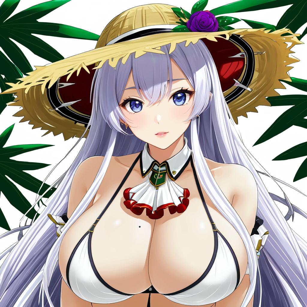 Algerie (azur lane), azur lane, 1girl, purple eyes, hair between eyes, mole under eye, grey hair, long hair, very long hair, white hair, large breasts, mole on breast, cleavage, white bikini, two-tone bikini, straw hat, hat flower, bare shoulders, twin drills, drill sidelocks, by artist hana kazari, anime