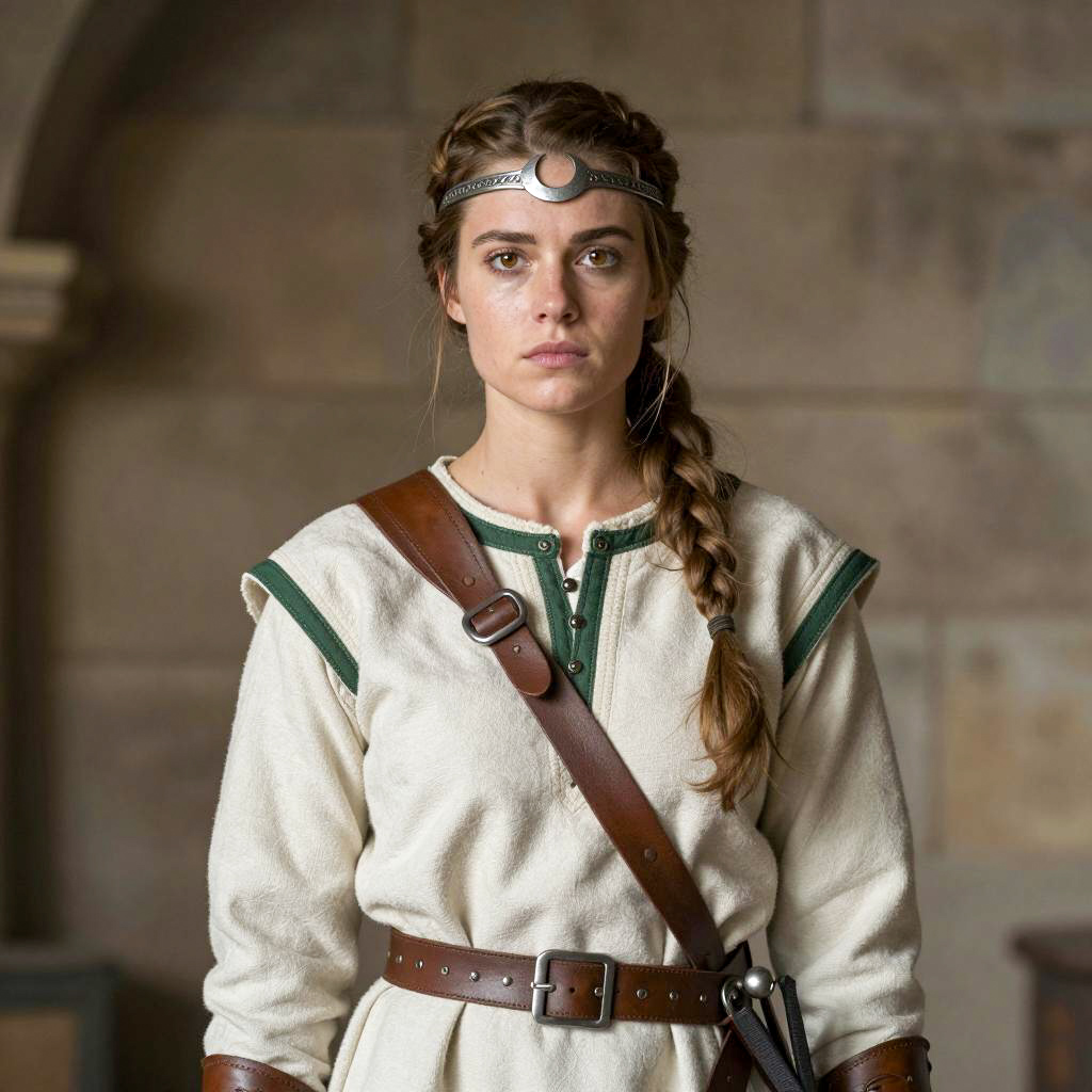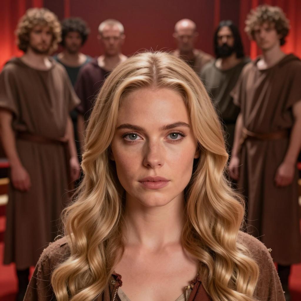 Close-up of a blonde woman with wavy hair, light skin, and neutral expression. Background: six men in brown, worn robes, red-lit setting. Men stand in a semi-circle, some looking downward, others at her. Red carpet below.