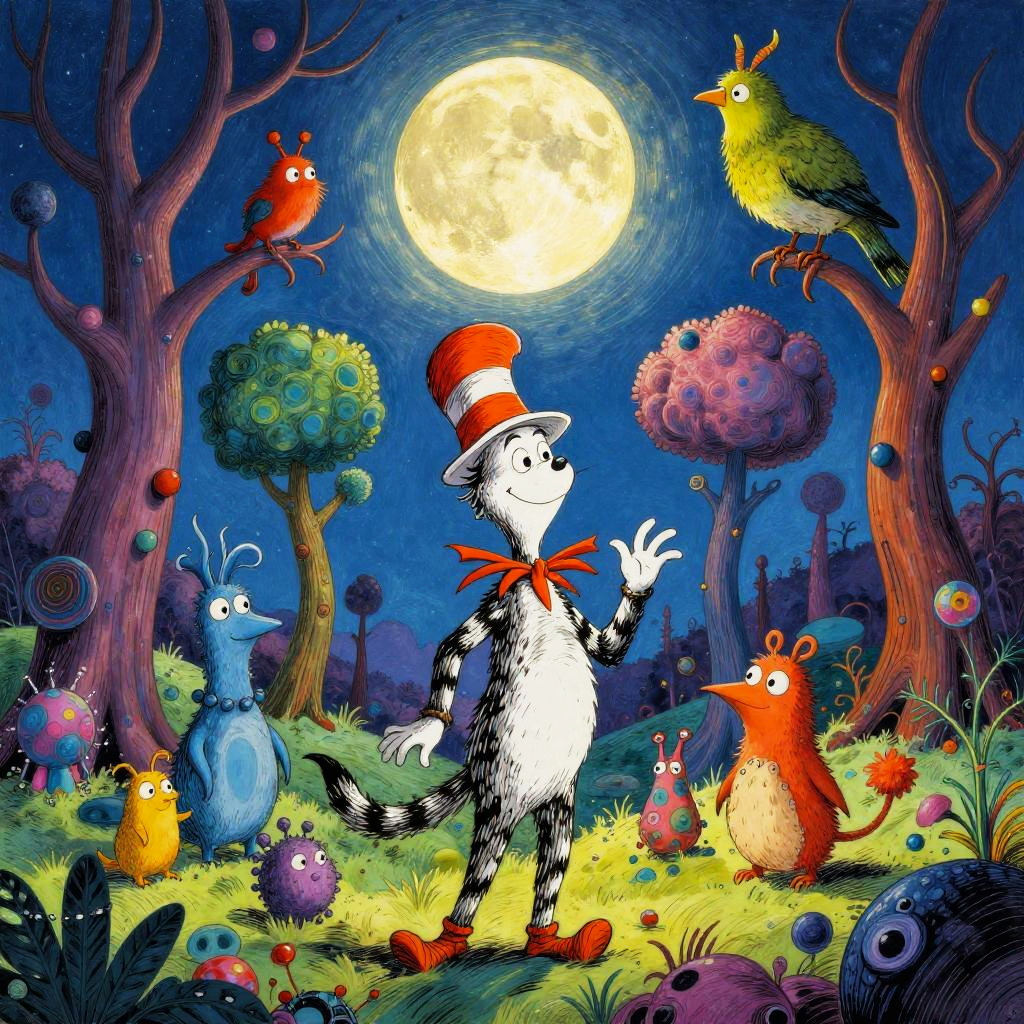 Dr Seuss the midnight paintings style, surreal whimsical landscapes with twisting colorful trees and strange creatures under a glowing moon, vibrant contrasting colors, dreamlike atmosphere, intricate linework, playful yet mysterious mood, fantasy art