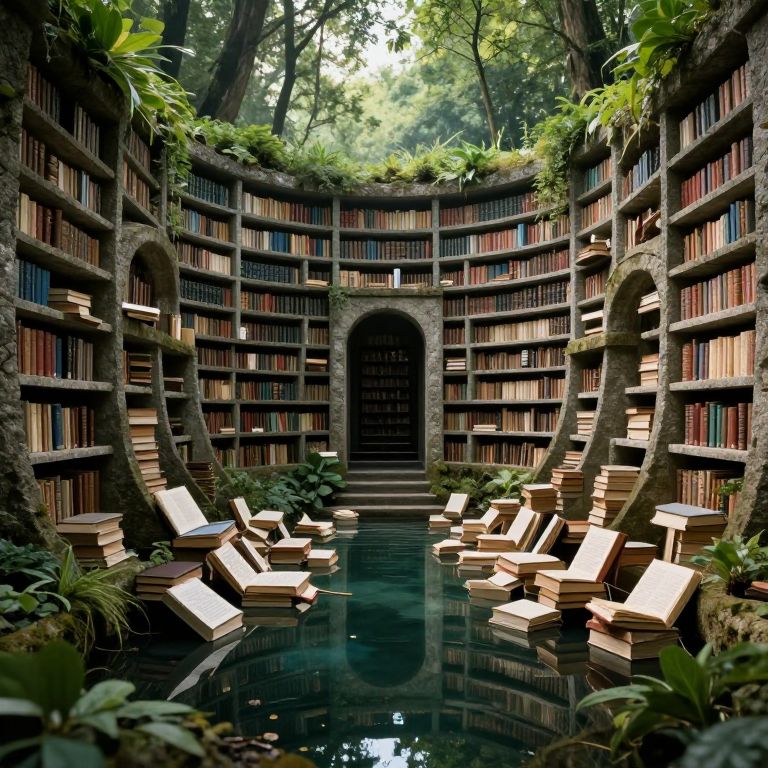 A labyrinthine underground library carved into ancient stone, its endless rows of books illuminated by a celestial light piercing through a cavernous ceiling, where gravity seems to bend and the boundaries between reality and imagination blur.