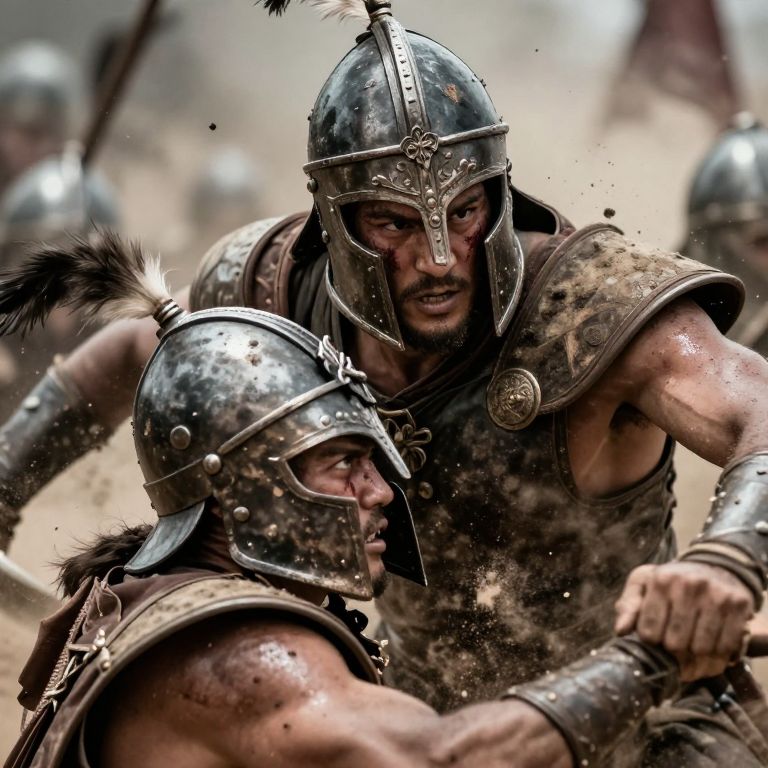 Photograph of intense battle scene: two muscular, dirty, armored warriors with fierce expressions, wearing helmets with feathers, fighting in dusty arena.