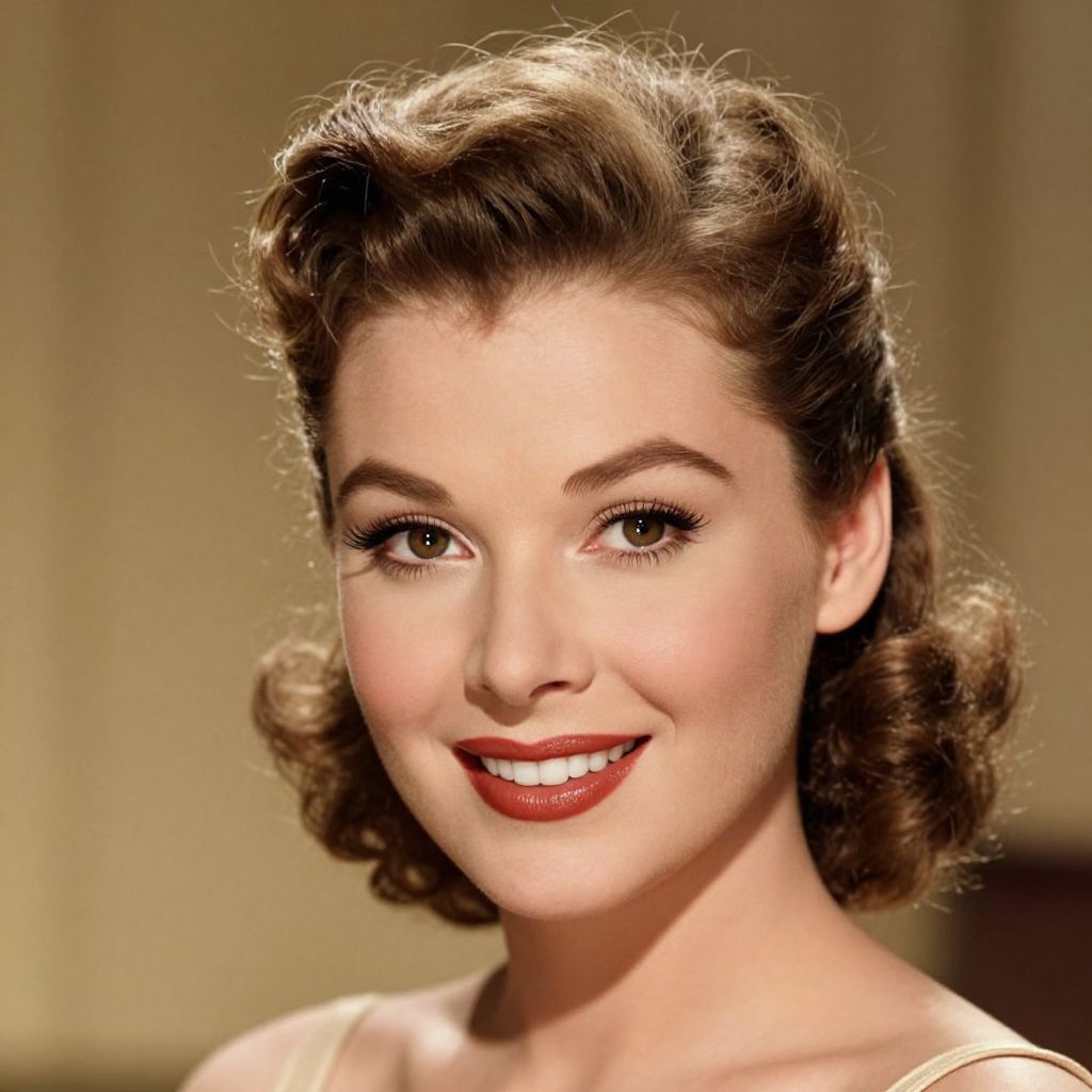 A vintage-inspired digital portrait captures a woman with a radiant smile reminiscent of classic Hollywood glamour, featuring a retro hairstyle akin to June Allyson's iconic look, rendered in high-definition detail with warm, nostalgic lighting effects.