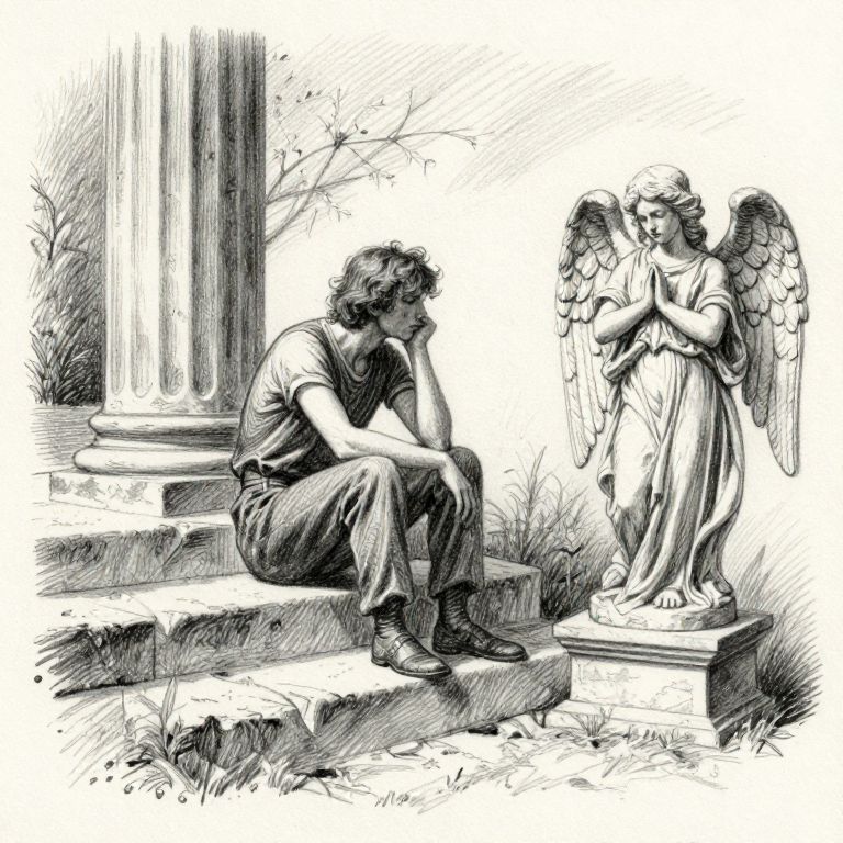 Contemplative Figure with Angel Statue