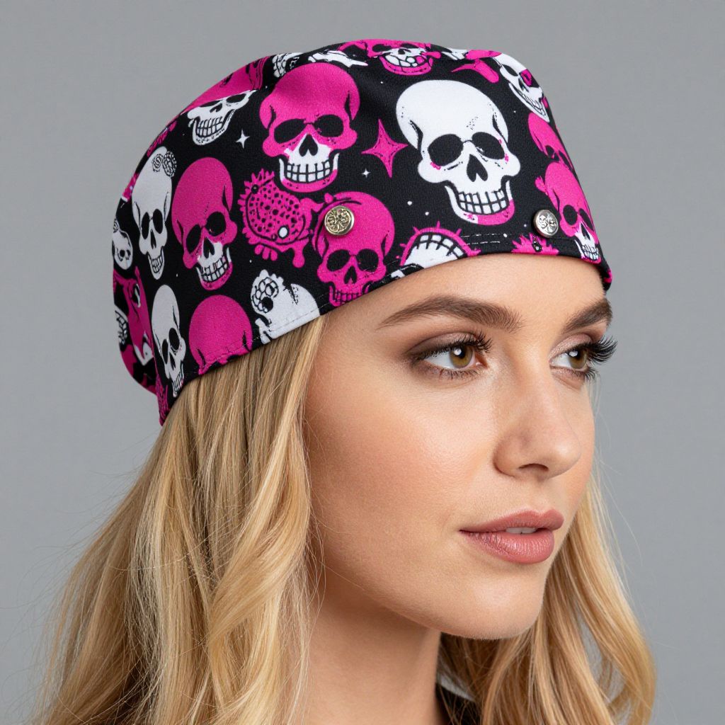 Blonde woman wearing a vibrant Voodoo Girl Fitted scrub cap featuring bold pink and white skull patterns, black background, and decorative buttons tied neatly beneath her chin.