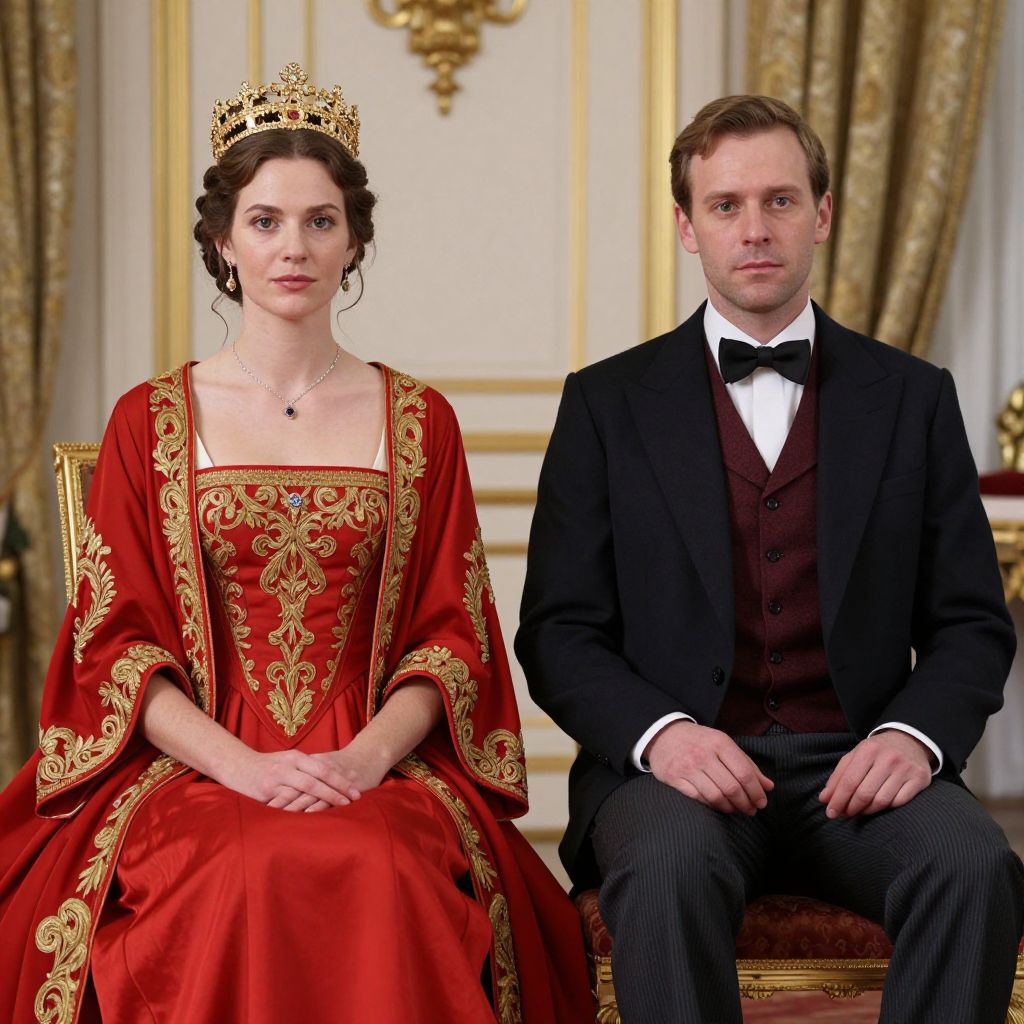 Elegantly dressed individuals seated side by side in a regal setting, featuring a woman adorned in a vibrant red gown with intricate gold embroidery and a golden crown, alongside a man in formal attire including a dark suit, maroon vest, and bow tie, both exuding an air of historical grandeur.