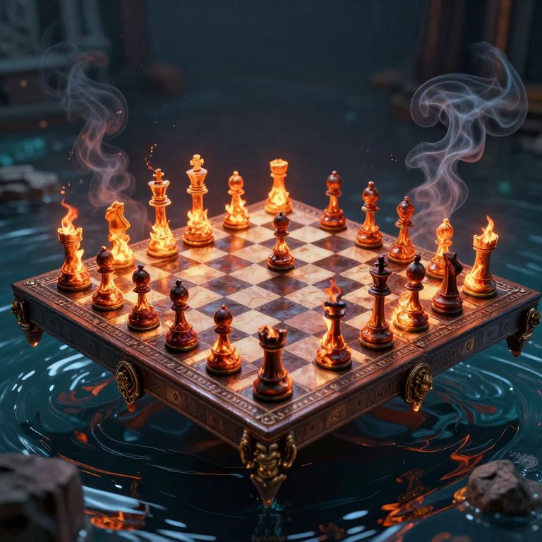 Photograph of a burning chessboard with flaming chess pieces, surrounded by ripples in dark water, emitting smoke. Dramatic, surreal scene.