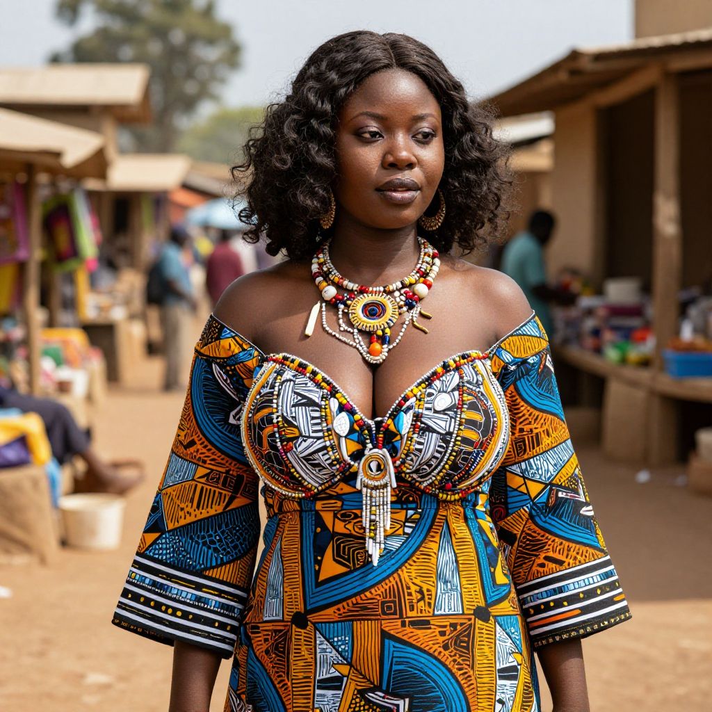 African styles woman costume in a vibrant traditional gown made of richly patterned fabric, featuring bold geometric prints and intricate beading, worn by a tall, warm-eyed African woman with deep brown skin, curly black hair, and a serene expression, standing in a sun-drenched village marketplace with colorful vendor stalls and wooden structures in the background.. The woman has big tits and cute face