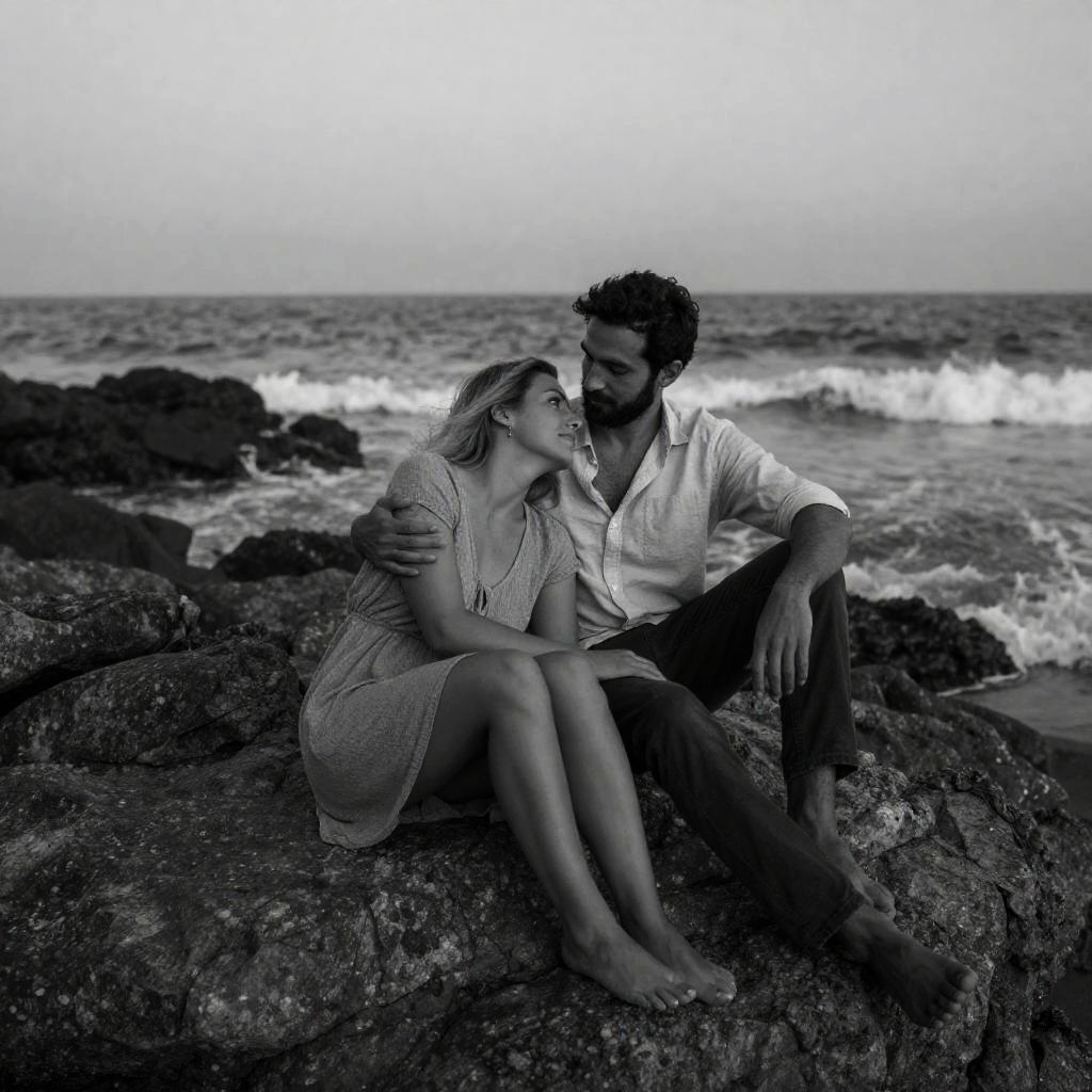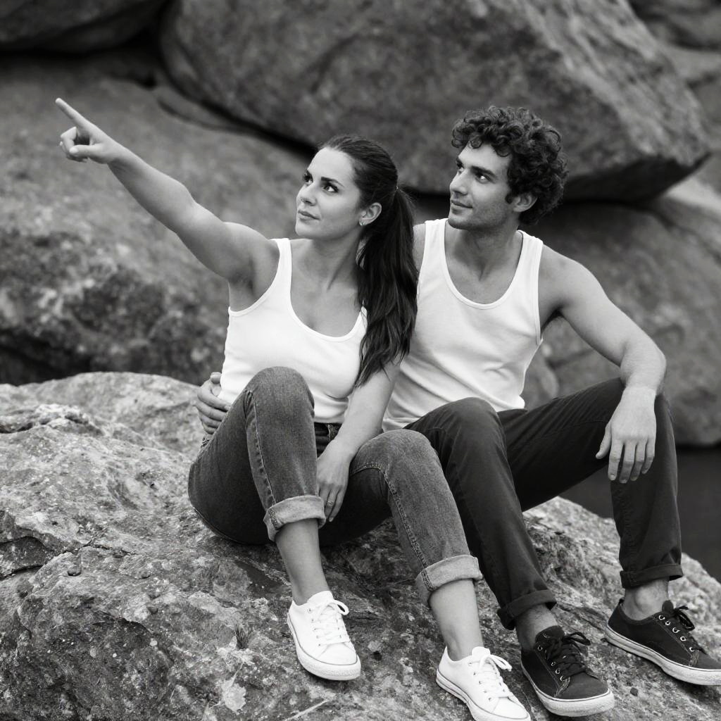 Black-and-white photograph of a couple sitting on a rock. The woman with long hair in a ponytail, wearing a tank top and cuffed jeans, points ahead. The man with curly hair, in a tank top and pants, leans back with arm around her. Rocky background. Both looking to the left. Casual, relaxed pose.