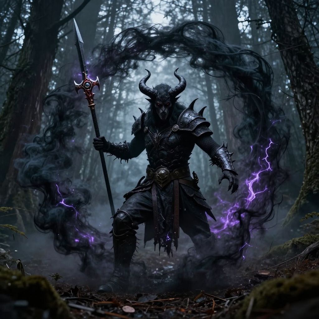Digital artwork of a dark, horned demon warrior with glowing purple flames, holding a spiked staff in a misty, dark forest.