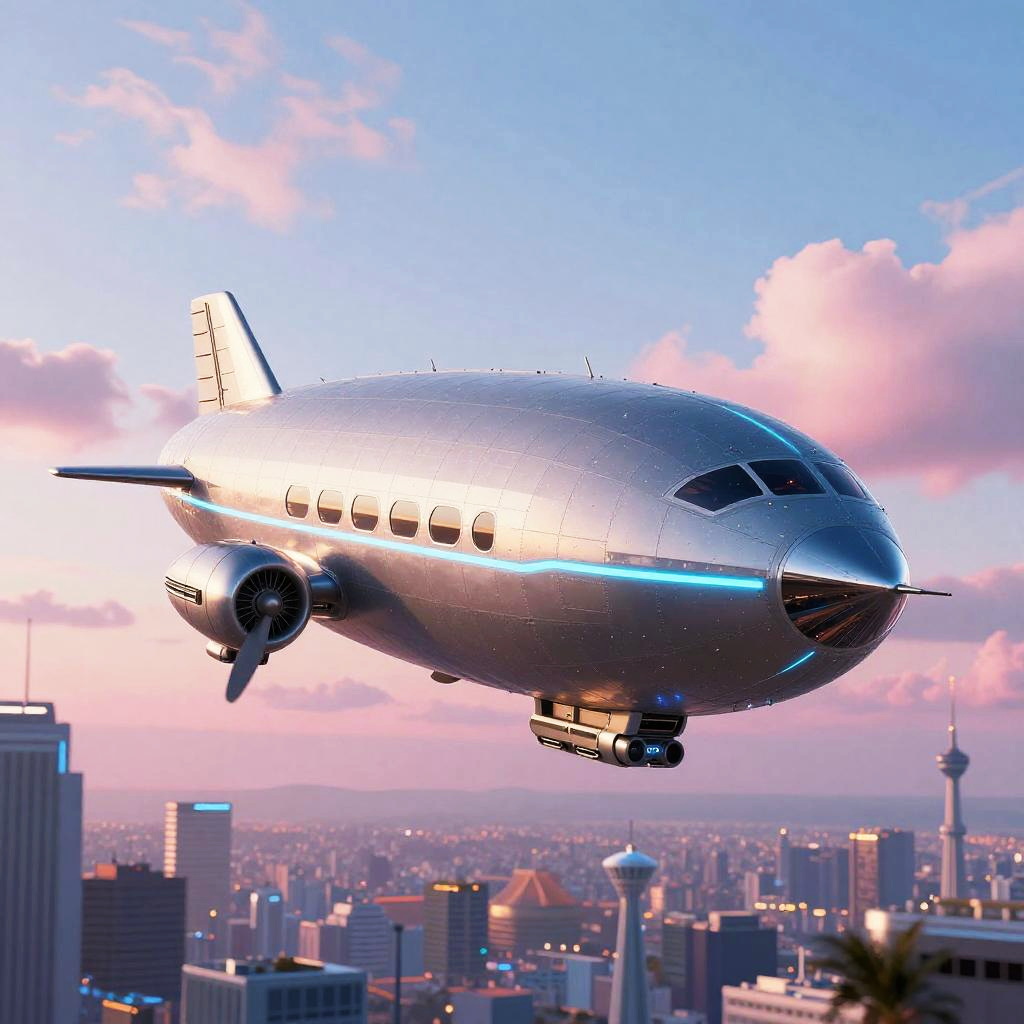 This is a digital illustration of a sleek, futuristic airship with a metallic, silver body and glowing blue accents. It has a streamlined shape, large propellers, and a rotating blade on top. The background features a pink and blue sunset sky, with a cityscape of tall buildings and towers. The airship's windows are curved and reflective. The overall style is sci-fi and vibrant.