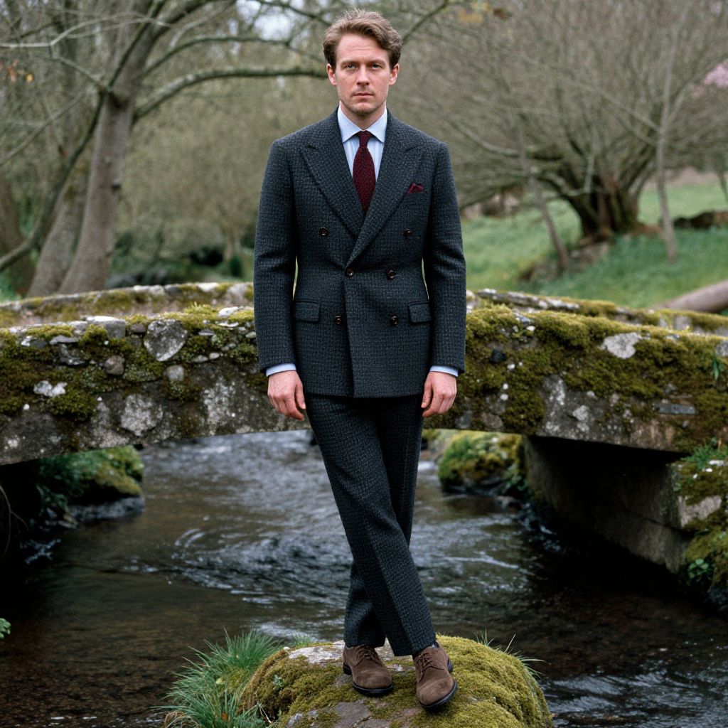 Photograph of a Caucasian man with short, dark brown hair, standing confidently on a moss-covered rock in a rustic, outdoor setting. He wears a dark, checkered tweed suit, white shirt, and maroon tie. Brown leather shoes complement his outfit. Behind him, a mossy stone bridge spans a small, flowing stream, with leafless trees and green grass in the blurred background. The man's serious expression and poised stance contrast with the natural, serene environment. The overall mood is sophisticated and timeless.