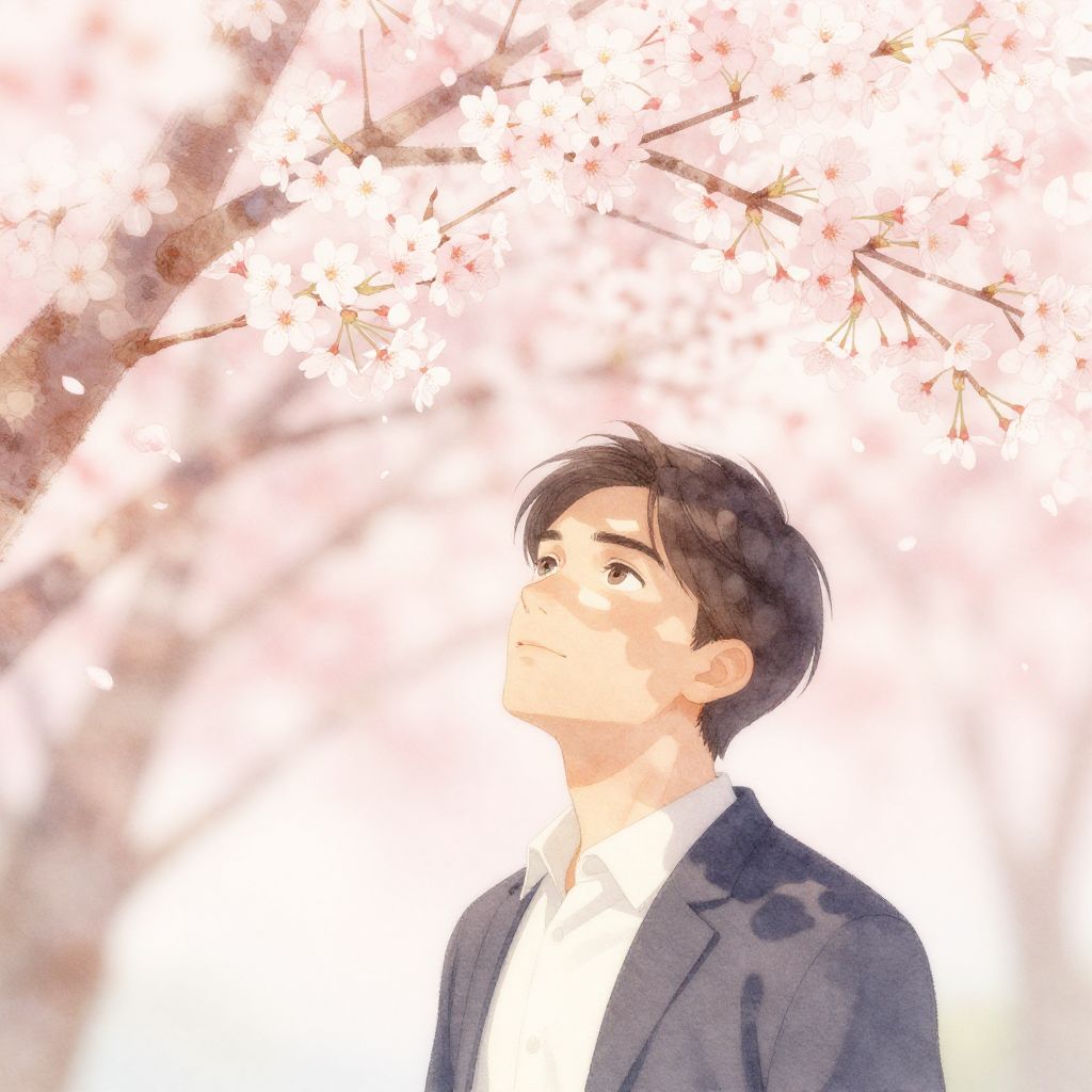 Serene scene: A gentleman stands beneath an enchanting canopy of blooming cherry blossoms, delicate petals gently swaying above him. Soft focus, warm light, gentle shadows dance across his face, as he gazes upwards in contemplation. Delicate lines, watercolor hues, whimsical charm, inviting atmosphere. Man has masculine face and piercing eyes