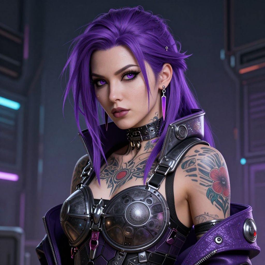 This digital art features a striking, purple-haired woman with pale skin and vivid purple eyes, wearing futuristic, black, metallic armor with circular breastplate details. She has prominent tattoos on her shoulders and chest, including colorful flowers and intricate designs. Her bold makeup enhances her piercing gaze. She's adorned with a black choker and purple leather jacket. The background is a dimly lit, sci-fi setting with neon lights and metallic textures, creating a cyberpunk atmosphere. The artwork is highly detailed and realistic, with a focus on textures and lighting to enhance the futuristic, edgy aesthetic.