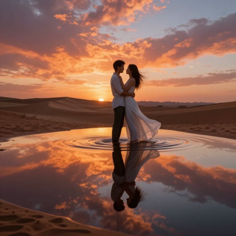 Photograph of a romantic sunset scene in a desert. A silhouetted couple stands in a shallow, reflective water pool, holding each other closely. The man wears a white shirt and dark pants, while the woman is in a flowing white dress. Their reflections are mirrored in the water. The sky is vibrant with orange, pink, and purple clouds, and the sun is low on the horizon. The desert landscape features sandy dunes in the background. The couple's shadows are dark and prominent against the colorful sky.