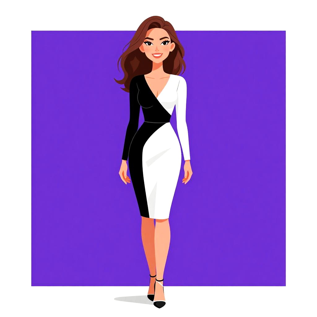 Illustration of a young woman with long dark brown hair, wearing a modern chic navy blue bodycon midi dress featuring a v-neckline with mesh insert, structured shoulders, and ruffle sleeve details. She has a red manicure and is posed against a plain purple studio background.