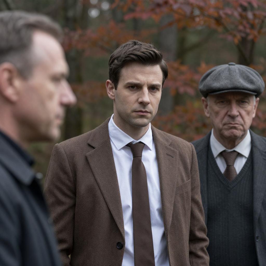 Three men standing outside near a car with an old stone building and greenery in the background. The central man has dark hair, wears a grey suit, white shirt, and black tie, and is holding a small black box while smiling. The man on the right has curly brown hair, a red shirt, and a black leather jacket with a neutral expression. The man on the left has short blond hair, a blue shirt, and a dark jacket, looking serious.