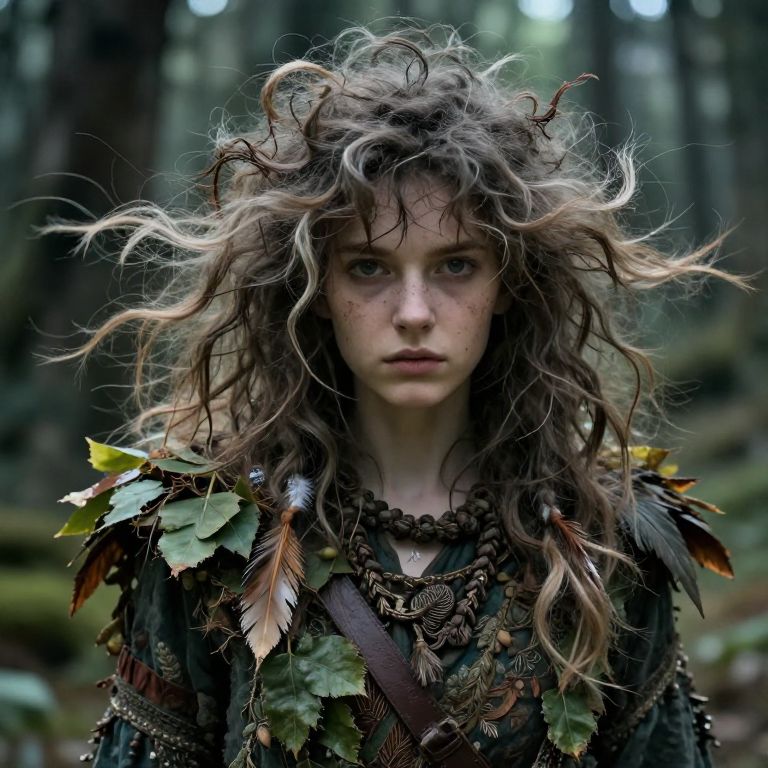 Photograph of a young woman with wild, curly brown hair blowing in the wind. She has fair skin with freckles and a serious expression. She wears a dark, earthy-toned outfit adorned with leafy and feathered accessories, including green leaves and brown feathers on her shoulders and a beaded necklace. The background is a blurred forest with tall trees, creating a natural, woodland atmosphere. The image has a fantasy or wilderness theme, with a slightly dramatic, ethereal feel.