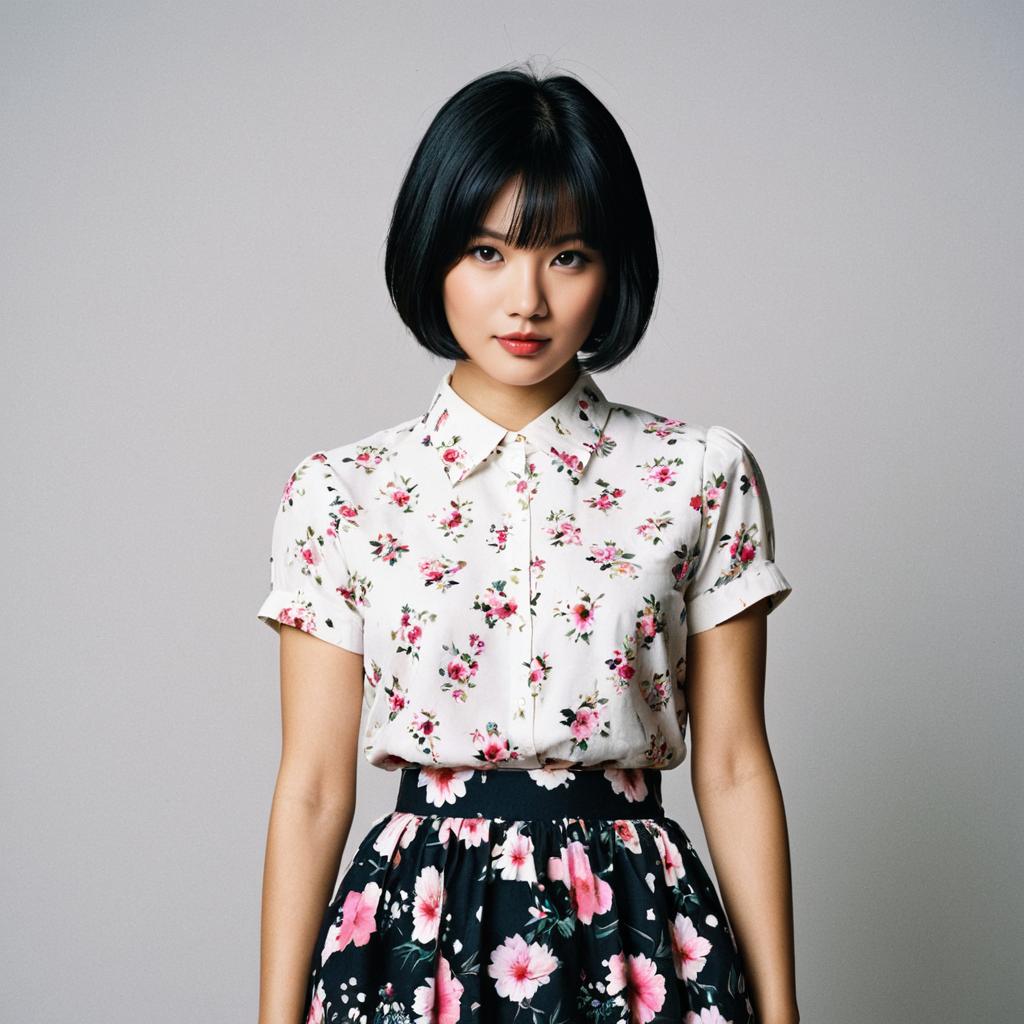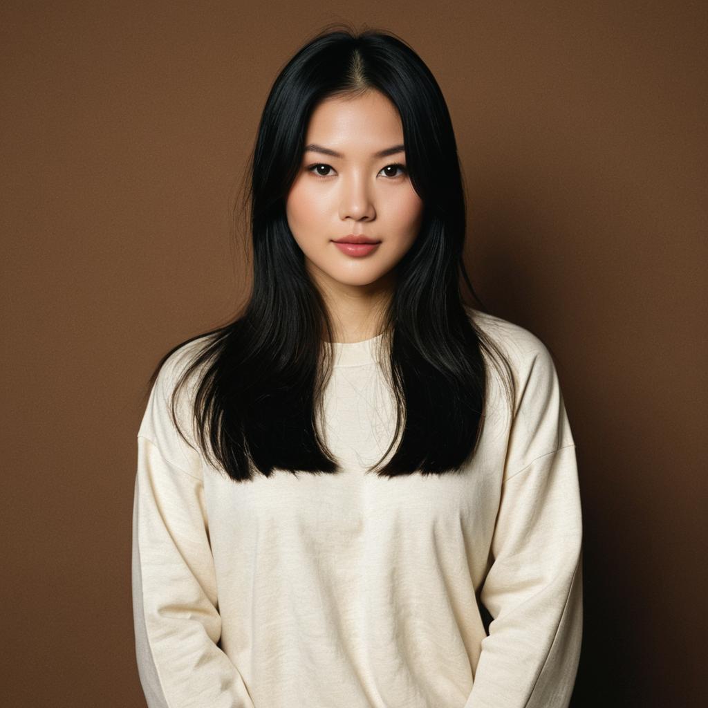Korean inspired,1girl, solo, realistic, black hair, looking at viewer, standing, long sleeves, lips, arms at sides, closed mouth, brown background, asian