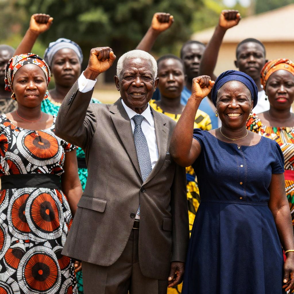 Photograph of a group of people outdoors. Central figures: elderly Black man in brown suit, raising right fist, smiling; Black woman in navy blue dress, raising right fist, smiling. Surrounding people: diverse African women, wearing patterned dresses, headscarves, and traditional attire. Background: blurred greenery, sunlight. Expressions: joyful, determined.