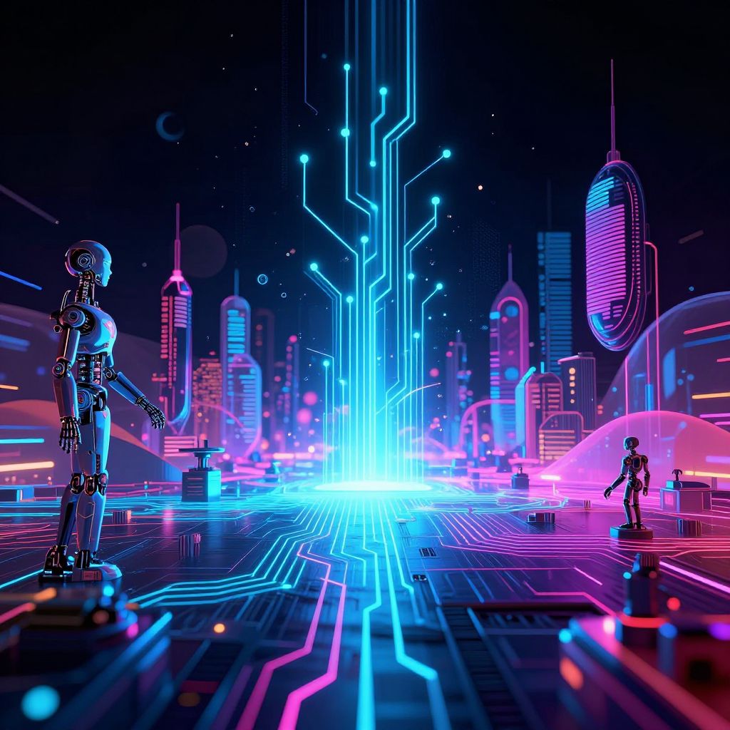 Futuristic reinterpretation of shogi with glowing neon pieces and holographic board, cyberpunk cityscape in the background, vibrant colors and reflections, sleek and modern design elements combined with traditional motifs, sci-fi digital art style